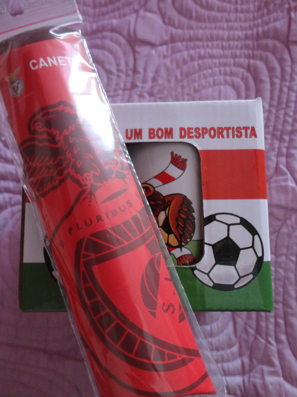 Está na altura de só querer coisas para a ps3, e obviamente que eu não lhe ia comprar nada, custa tudo uma fortuna!! Como quando fomos a Lisboa em Maio ele comprou umas coisas na loja do Benfica, mas elas acabaram por se estragar ou perder, decidi renovar-lhe a colecção com uma caneca (ele adoraa usar as minhas e não pode ser nada) e uma caneta oficial. Para além disso, enchi a caneca de kinderes, porque se há pessoa mais gulosa que eu só ele!! Total da prendinha: 7,75 €